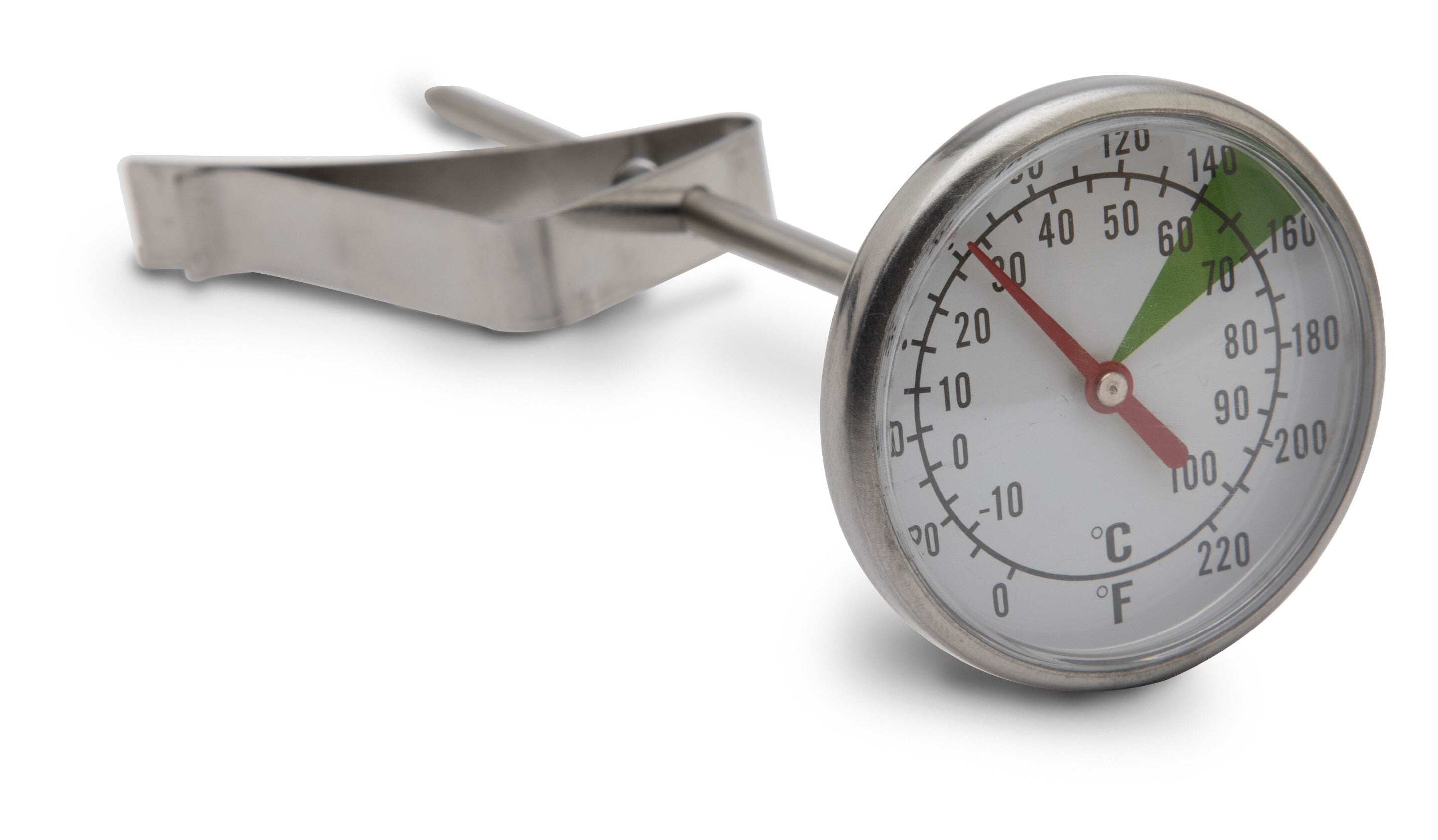 Stainless steel immersion thermometer with double scale dial and green area to indicate the ideal temperature. Thanks to the clip, it can be anchored to all LELIT milk jugs. Food contact material.